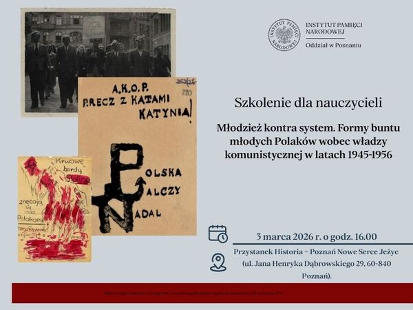 03/03/2026ZaproszenieSzkolenie dla nauczycieli „Młodzież kontra system. Formy buntu młodych Polaków wobec władzy komunistycznej w latach 1945-1956” – Poznań, 3 marca 2026