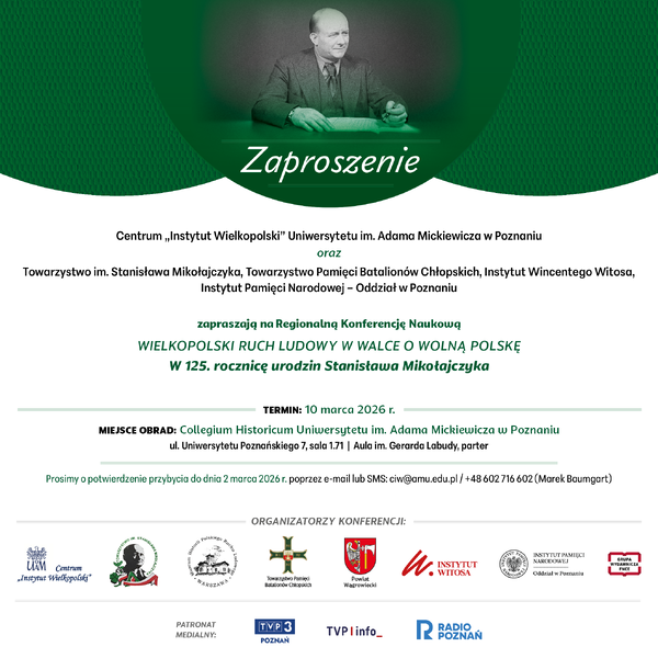 10/03/2026ZaproszenieRegionalna Konferencja Naukowa „Wielkopolski ruch ludowy w walce o wolną Polskę” – Poznań, 10 marca 2026