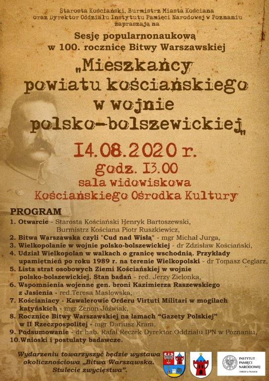 W piątek 14 sierpnia 2020 w Kościanie, w przeddzień setnej rocznicy Bitwy Warszawskiej, odbyła się konferencja popularnonaukowa ,,Mieszkańcy powiatu kościańskiego w wojnie polsko-bolszewickiej’’. Z uwzględnieniem reżimu sanitarnego, w salki Kościańskiego Ośrodka Kultury zgromadzeni wysłuchali referatów przygotowanych przez historyków i regionalistów. Wydarzenie było współorganizowane przez Starostwo Powiatowe w Kościanie, Urząd Miasta Kościana oraz poznański oddział Instytutu Pamięci Narodowej.