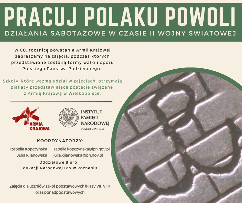 Zapraszamy uczniów szkół podstawowych (klasy VII-VIII) oraz ponadpodstawowych na zajęcia online z okazji 80. rocznicy powstania Armii Krajowej. Podczas lekcji przypomnimy postacie związane z AK, liczne brawurowe akcje oraz hasła, utwierdzające rodaków w przekonaniu, że Polska – mimo iż pod okupacją – nadal istnieje.