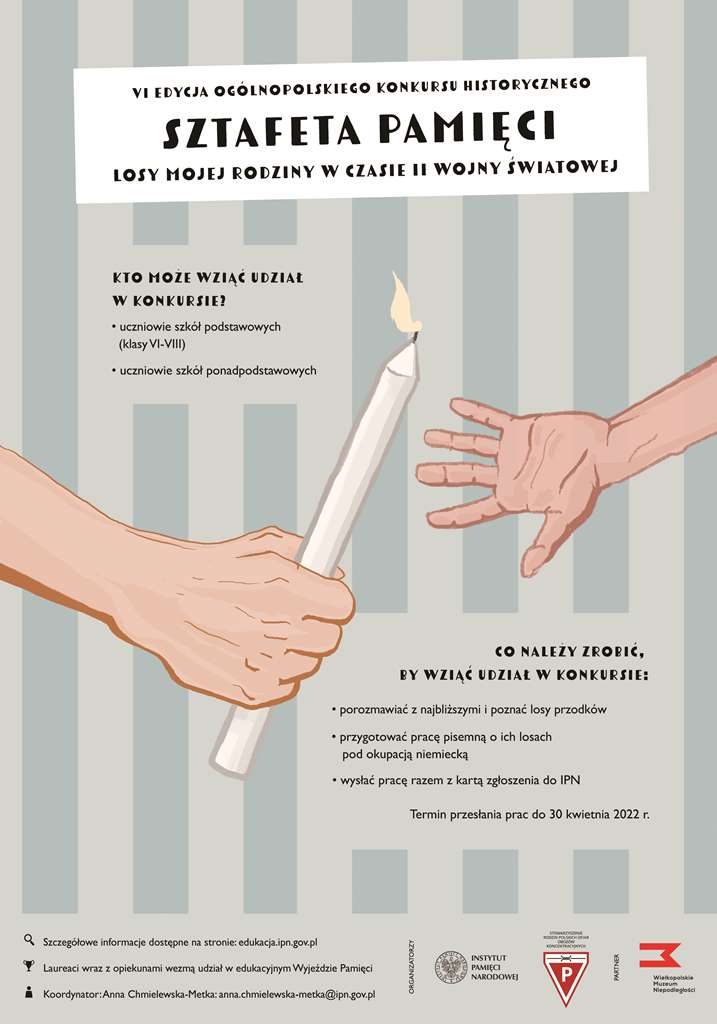 Oddziałowe Biuro Edukacji Narodowej Instytutu Pamięci Narodowej już po raz szósty serdecznie zaprasza uczniów szkół podstawowych klas VI-VIII i szkół ponadpodstawowych do udziału w ogólnopolskim konkursie „Sztafeta Pamięci – losy mojej rodziny w czasie II wojny światowej”.