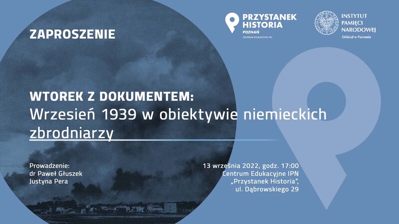 W ramach „Wtorku z dokumentem” zapraszamy 13 września 2022 r. o godz. 17:00 do Przystanku Historia przy ul. Dąbrowskiego 29 na spotkanie „Wrzesień 1939 w obiektywie niemieckich zbrodniarzy”, podczas którego zostaną zaprezentowane fotografie zgromadzone w ramach projektu „Archiwum Pełne Pamięci”. Poprowadzą je archiwiści z Oddziałowego Archiwum IPN w Poznaniu: dr Paweł Głuszek i Justyna Pera.