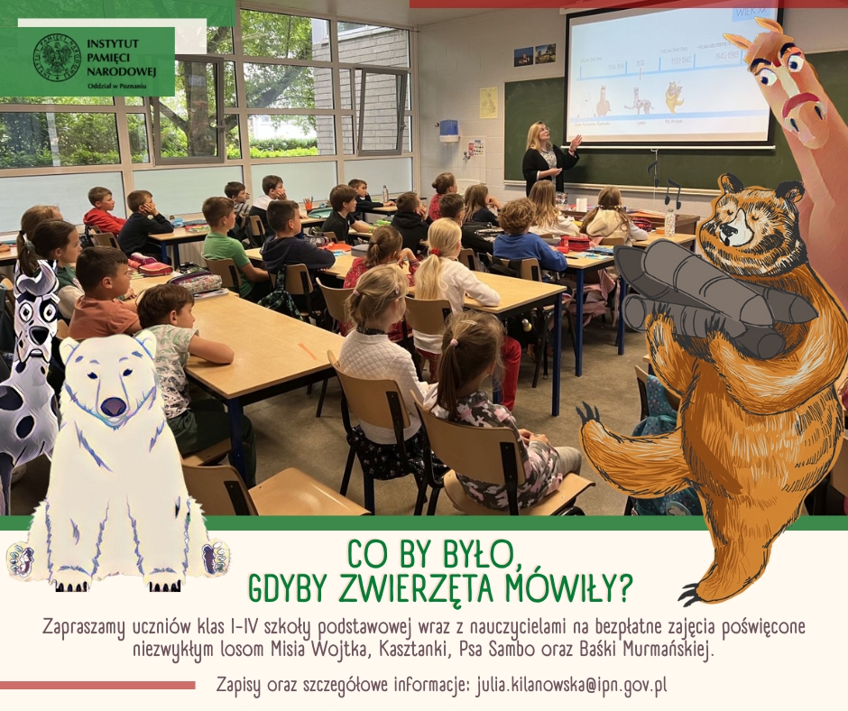 Podczas warsztatów uczniowie poznają historię wybranego bohatera: Misia Wojtka, Kasztanki, Psa Sambo czy Baśki Murmańskiej. Wspólnie obejrzymy także animowany film oraz zagramy w gry planszowe. Uczestnicy otrzymają ciekawe gadżety z wizerunkami zwierzaków.