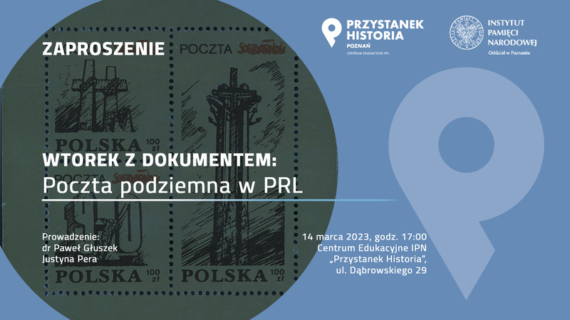W ramach cyklu „Wtorek z dokumentem” w Centrum Edukacyjnym IPN „Przystanek Historia” nasze najbliższe spotkanie, które odbędzie się 14 marca 2023 r. o godz. 17:00, będzie poświęcone znaczkom poczty podziemnej wydawanym w latach 1980-1989 przez środowiska opozycyjne w Polsce.