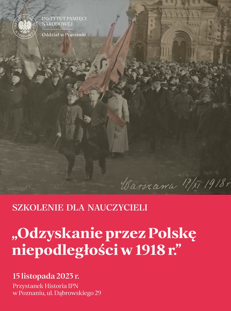 W dniu 15 listopada 2023r. w Przystanku Historia IPN w Poznaniu przy ulicy J.H. Dąbrowskiego 29, nauczyciele wzięli udział w szkoleniu „Odzyskanie przez Polskę niepodległości w 1918 r.” . Uczestnicy podczas zajęć mogli zapoznać się z wybranymi materiałami edukacyjnymi IPN: wystawą „Ojcowie Niepodległości”, przedstawiającą najważniejsze osoby, którym zawdzięczamy odzyskanie niepodległości, teką edukacyjną „Polski gen wolności” przybliżającą w sposób interdyscyplinarny historię Polski w latach 1768-1918 oraz wyborem źródeł „Polskie drogi do niepodległości 1914-1918” zawierającym dokumenty wraz z ćwiczeniami, obejmujące takie zagadnienia jak: polskie idee odzyskania niepodległości, polskie formacje walczące w I wojnie światowej, sprawa polska w polityce zagranicznej oraz codzienność Polaków podczas Wielkiej Wojny.