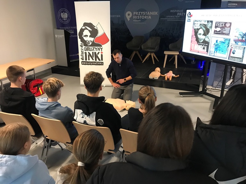 W dniach 27-28 listopada 2023 r. w Przystanku Historia odbyły się zajęcia w ramach projektu „Drużyna Inki”. Podczas lekcji, które prowadził edukator Dominik Mojek, młodzież poznała życiorys niezłomnej Danuty Siedzikówny „Inki”. Przesłanie, jakie nam pozostawiła stało się punktem wyjścia do dyskusji: co obecnie oznacza zdania „zachowałam się jak trzeba”? Podczas zajęć młodzież wysłuchała również wykładu na temat obojętności wobec zjawiska hejtu i wykluczenia oraz konsekwencji, jakie niesie ze sobą brak reakcji na takie zachowanie. Następnie odbyło się teoretyczne i praktyczne szkolenie z pierwszej pomocy przedmedycznej w zakresie RKO.