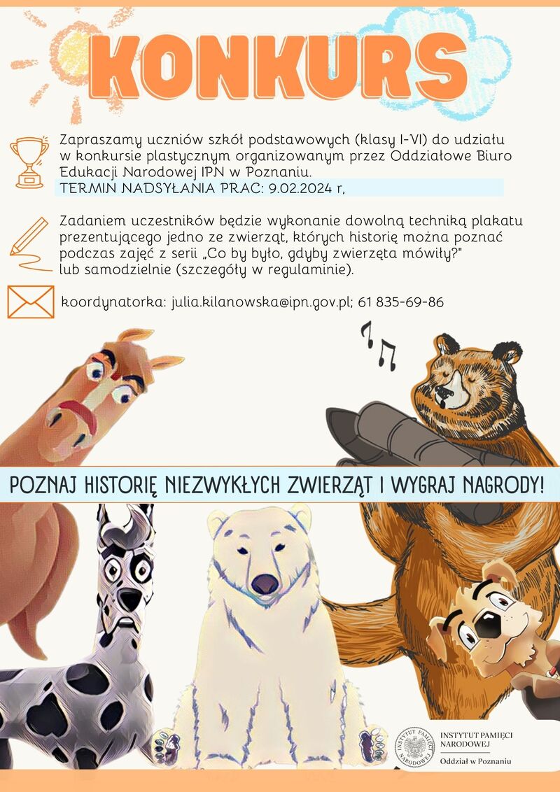 Serdecznie zapraszamy uczniów szkół podstawowych (klasy I-VI) do udziału w konkursie plastycznym. Celem konkursu jest ukazanie dzieciom historii Polski oraz świata w wieku XX przy wykorzystaniu materiałów edukacyjnych przygotowanych Instytut Pamięci Narodowej. Uczestnicy, przez pryzmat losów zwierzęcych bohaterów, zdobywają i utrwalają swoją wiedzę z zakresu ważnych wydarzeń w dziejach państwa, a także losów jego obywateli.