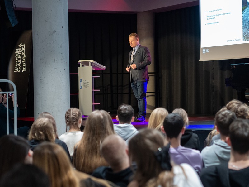 Wykład wygłosił Marcin Podemski, który przybliżył uczniom postać Leona Prauzińskiego, jego dorobek artystyczny oraz tragiczny los Powstańca Wielkopolskiego zamordowanego przez Niemców w 1940 r. w Forcie VII w Poznaniu.