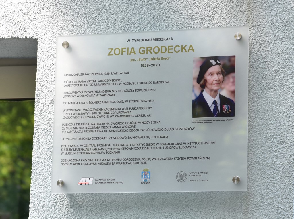 Zofia Grodecka ps. „Ewa”, „Biała Ewa” była weteranką Armii Krajowej oraz uczestniczką Powstania Warszawskiego. Była córką znanego bibliografa i bibliotekarza Stefana Vrtela-Wierczyńskiego oraz Janiny z Anców. Urodziła się we Lwowie, następnie mieszkała w Poznaniu, a od 1937 roku w Warszawie. Zofia Grodecka 15 marca 1943 roku złożyła uroczystą przysięgę i wstąpiła do Armii Krajowej. Po przeszkoleniu wojskowym została przydzielona do 209 plutonu 21 pp „Dzieci Warszawy” (kryptonim Żaglowiec). Podczas Powstania Warszawskiego była strzelcem, łączniczką oraz adiutantką ppłk. Mieczysława Niedzielskiego ps. „Żywiciel”. Brała udział w drugim natarciu na Dworzec Gdański. Pod koniec sierpnia 1944 roku została bardzo poważnie ranna (przestrzał potylicy) oraz dodatkowo uszkodziła kręgosłup podczas bombardowania Żoliborza. Od tego czasu przebywała w szpitalach powstańczych oraz pod opieką rodziców. Po kapitulacji została skierowana do niemieckiego obozu przejściowego Dulag 121 Pruszków, ale z pomocą rodziców udało jej się uciec. Po wojnie wróciła do Poznania. Po transformacji ustrojowej aktywnie włączyła się w działalność Światowego Związku Żołnierzy Armii Krajowej Okręg Wielkopolska jako przewodnicząca Komisji Historycznej oraz redaktorka naczelna „Biuletynu Informacyjnego”. Za zasługi wojenne orz działalność społeczną była wielokrotnie odznaczana. Przyznano jej m.in. „Warszawski Krzyż Powstańczy”, „Krzyż Armii Krajowej” oraz „Krzyż Oficerski Orderu Odrodzenia Polski”. Zmarła po długiej chorobie 9 lutego 2020 r.– jej grób znajduje się na ternie cmentarza górczyńskiego w Poznaniu i został wpisany do ewidencji grobów weteranów walk o Wolność i Niepodległość Polski.