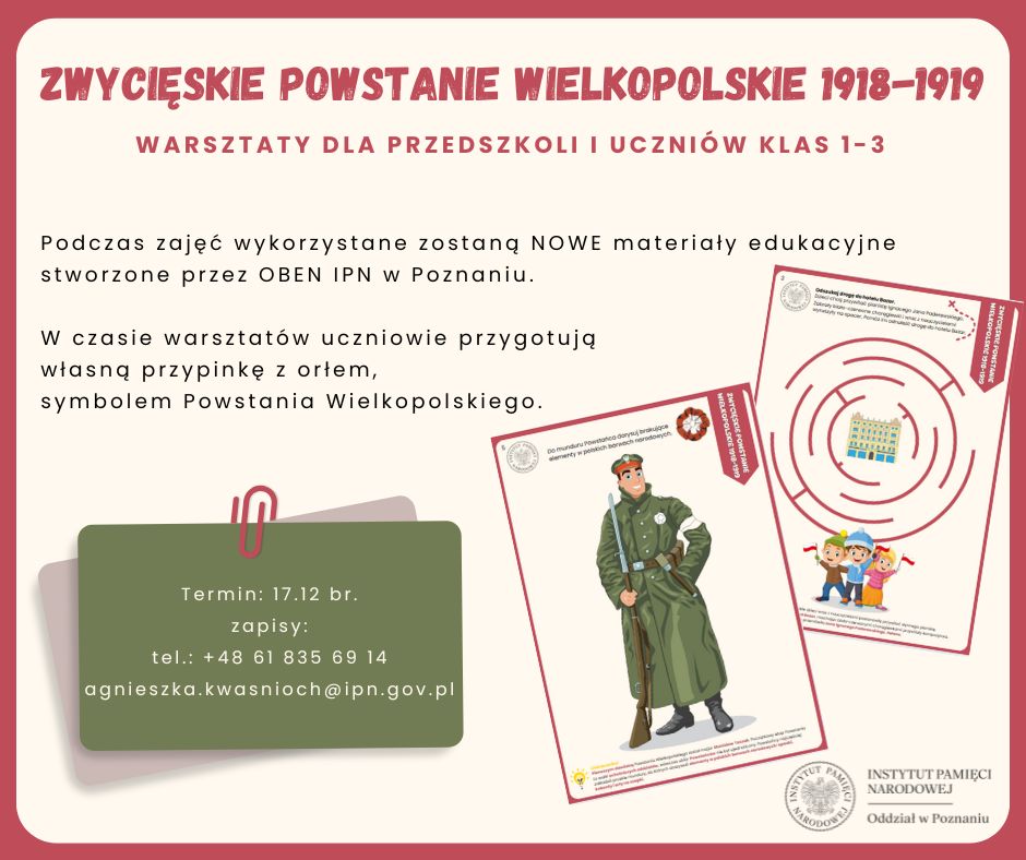 Zapraszamy przedszkolaków oraz uczniów klas 1-3 na warsztaty z okazji 106. rocznicy wybuchu Zwycięskiego Powstania Wielkopolskiego. Podczas zajęć wykorzystane zostaną nowe materiały edukacyjne stworzone przez IPN w Poznaniu. Ponadto uczniowie stworzą własną przypinkę z orłem, symbolem Zwycięskiego Powstania, którą będą mogli zabrać na uroczystości rocznicowe. Zajęcia odbędą się 17 grudnia 2024 r. w Przystanku Historia IPN przy ul. Dąbrowskiego 29 w Poznaniu.