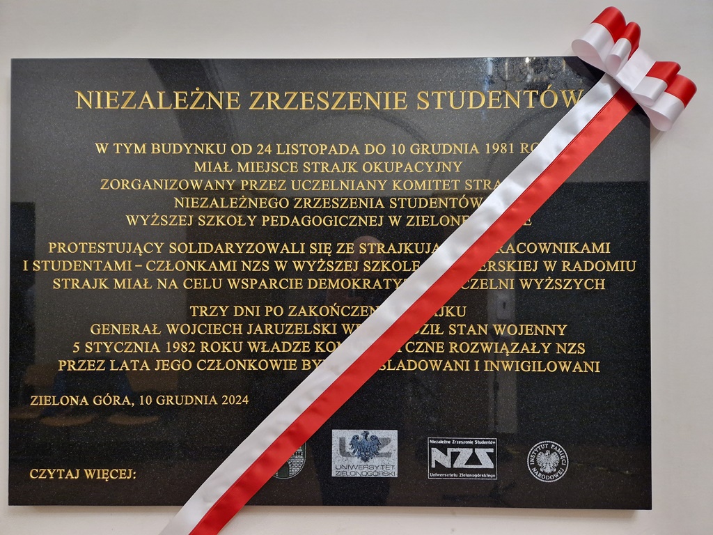 10 grudnia 2024 r. w budynku Wydziału Prawa i Administracji Uniwersytetu Zielonogórskiego odbyła się uroczystość odsłonięcia tablicy upamiętniającej 43. rocznicę zakończenia strajku Niezależnego Zrzeszenia Studentów przy dawnej Wyższej Szkole Pedagogicznej w Zielonej Górze.