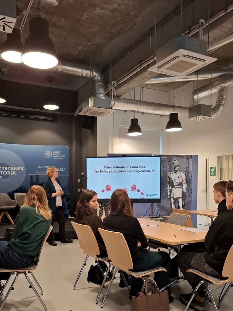 Kolejne zajęcia „Bitwa o Monte Cassino 1944. Czy Polacy zdecydowali o zwycięstwie?” przeprowadziły dr Katarzyna Florczyk, dr Izabella Kopczyńska oraz Agnieszka Kwaśnioch. Podczas tej lekcji uczniowie, pracując z infografiką, kartami pracy oraz filmem prześledzili „szlak nadziei” żołnierzy armii gen. Andersa. Młodzież doskonale poradziła sobie z trudnymi zadaniami, analizując drogę żołnierzy z ZSRR przez Iran, Irak, Palestynę oraz Egipt do Włoch. Następnie uczniowie zapoznali się z tekstem pieśni „Czerwone Maki na Monte Cassino”, dzięki czemu dowiedzieli się, jak ważnym wydarzeniem było zdobycie przez Polaków klasztornego wzgórza oraz jakie były losy żołnierzy II Korpusu Polskiego po zakończeniu wojny.