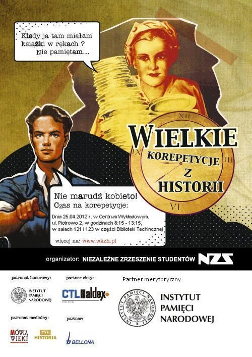Wychodząc naprzeciw potrzebie podniesienia poziomu świadomości historycznej wśród młodego pokolenia Polaków, a co się z tym wiąże – umocnienia poczucia ich tożsamości narodowej, Instytut Pamięci Narodowej oraz Niezależne Zrzeszenie Studentów zapraszają licealistów i studentów do wzięcia udziału w nowym ogólnopolskim projekcie „Wielkie Korepetycje z Historii”. Do udziału w tym jakże ważnym – biorąc pod uwagę dotychczasową mierną podstawę programu nauczania historii w szkołach ponadgimnazjalnych – przedsięwzięciu przystąpiły największe ośrodki akademickie w kraju: Warszawa, Poznań, Katowice, Wrocław, Lublin.