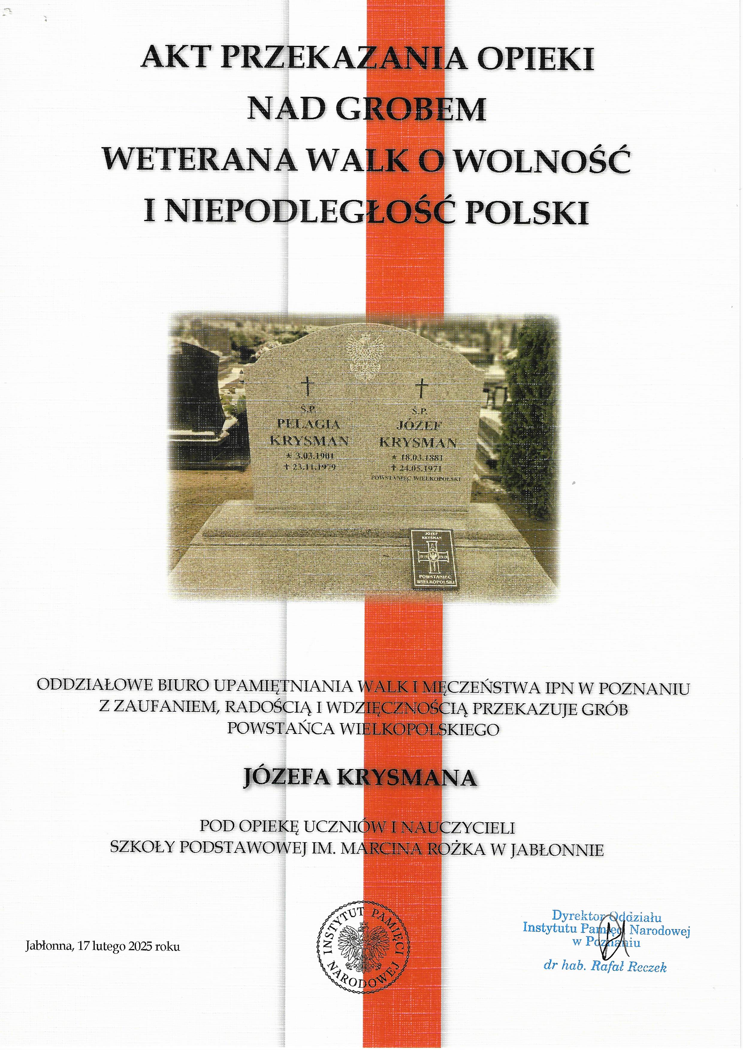17 lutego 2025 r. odbyło się uroczyste przekazanie opieki nad grobem weterana walk o wolność i niepodległość Polski Józefa Krysmana Szkole Podstawowej im. Marcina Rożka w Jabłonnie. Nowy nagrobek weterana, znajdujący się na cmentarzu komunalnym w Jabłonnie, powstał z inicjatywy prezesa Stowarzyszenia Sołtysów Powiatu Nowotomyskiego Arkadiusza Kaźmierczaka w 2024 r. Remont został sfinansowany przez Instytut Pamięci Narodowej Oddział w Poznaniu.