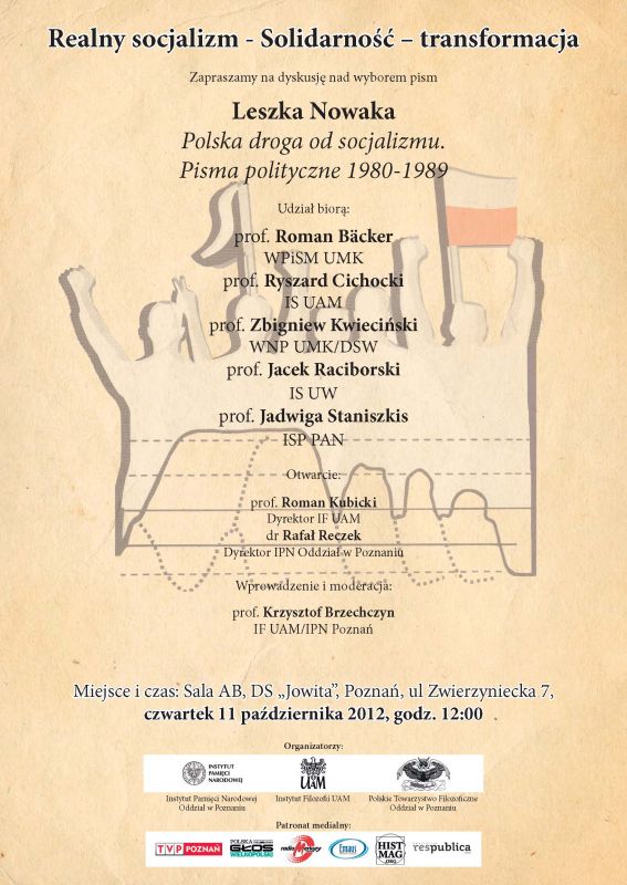 W czwartek 11 października 2012 r. w Poznaniu odbyła się dyskusja panelowa „Realny socjalizm – Solidarność – transformacja” z udziałem prof. Romana Bäckera (Wydział Politologii i Studiów Międzynarodowych UMK), prof. Ryszarda Cichockiego (Instytut Socjologii UAM), prof. Zbigniewa Kwiecińskiego (Wydział Nauk Pedagogicznych UMK), prof. Jacka Raciborskiego (Instytut Socjologii UW) i prof. Jadwigi Staniszkis (Instytut Studiów Politycznych PAN); Moderatorem dyskusji był prof. Krzysztof Brzechczyn (IPN Poznań/Instytut Filozofii UAM). Przedmiotem dyskusji była wydana przez Oddział Instytutu Pamięci Narodowej w Poznaniu książka Leszka Nowaka Polska droga od socjalizmu. Pisma polityczne 1980–1989. Spotkanie zostało zorganizowane przez poznański oddział Instytutu Pamięci Narodowej, Instytut Filozofii UAM i Polskie Towarzystwo Filozoficzne Oddział w Poznaniu.
