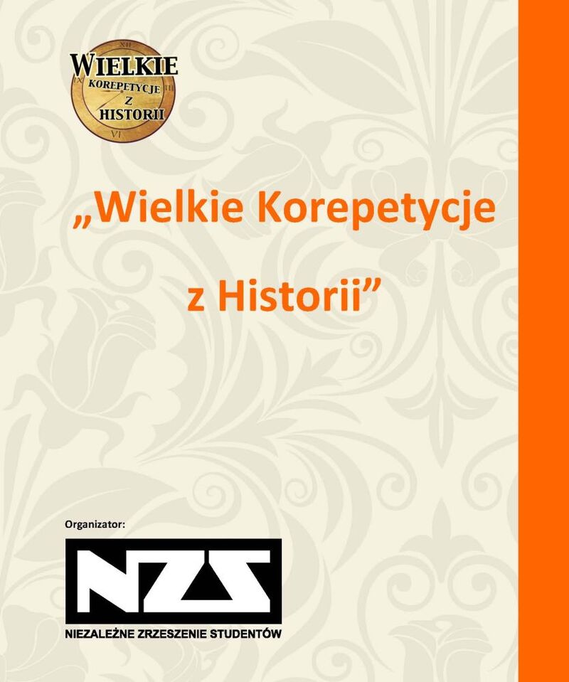 Mając na względzie potrzebę podniesienia poziomu świadomości historycznej młodego pokolenia Polaków, Instytut Pamięci Narodowej oraz Niezależne Zrzeszenie Studentów zapraszają licealistów i studentów do wzięcia udziału w kolejnej edycji ogólnopolskiego projektu „Wielkie Korepetycje z Historii”. Do udziału w przedsięwzięciu po raz kolejny przystąpiły największe ośrodki akademickie w kraju: Warszawa, Poznań, Katowice, Wrocław, Lublin, Kraków, Gdańsk i Tarnów.