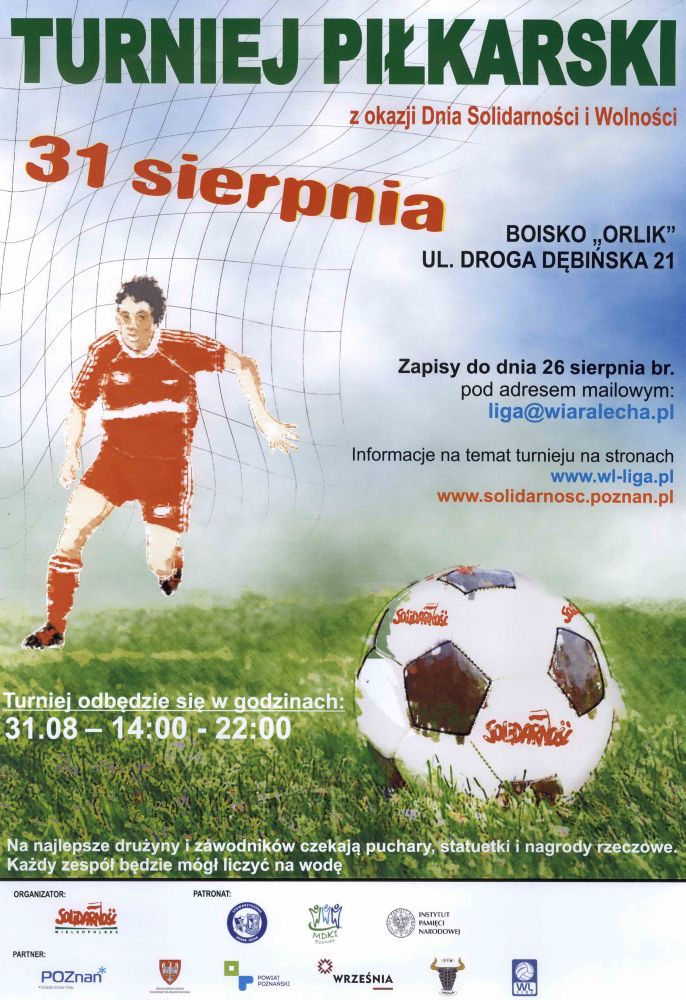 W ramach tegorocznych uroczystości w 33. rocznicę podpisania Porozumień Sierpniowych NSZZ „Solidarność” Region Wielkopolska zaprasza na II Turniej Piłkarski z okazji Dnia Solidarności i Wolności. Patronat nad imprezą objął Instytut Pamięci Narodowej Oddział w Poznaniu i Stowarzyszenie Wiara Lecha. Turniej odbędzie się 31 sierpnia 2013 w godzinach 14.00 – 22.00 na boisku Młodzieżowego Domu Kultury nr 1 przy ul. Droga Dębińska 21.