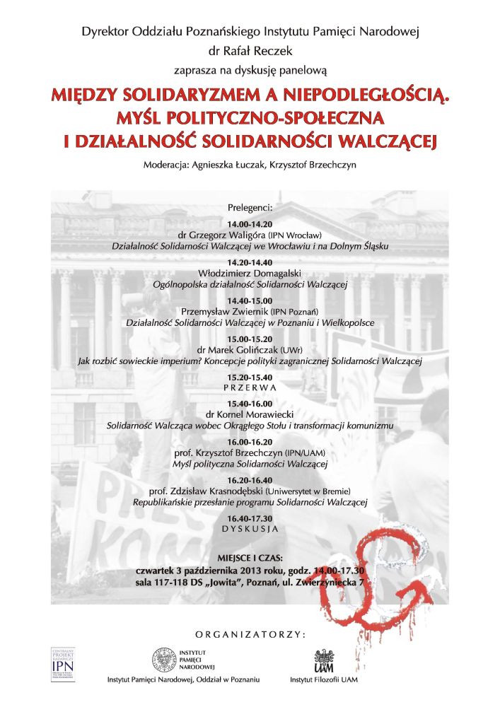 W ramach obchodów 30. rocznicy powstania poznańskich struktur Solidarności Walczącej Instytut Pamięci Narodowej Oddział w Poznaniu we współpracy z Instytutem Filozofii Uniwersytetu im. Adama Mickiewicza w Poznaniu zaprasza do udziału w dyskusji panelowej „Między solidaryzmem a niepodległością. Myśl polityczno-społeczna i działalność Solidarności Walczącej". Dyskusja odbędzie się w czwartek 3 października 2013 roku w godzinach 14.00 – 18.00 w sali 117-118 DS „Jowita" przy ul. Zwierzynieckiej 7 w Poznaniu.