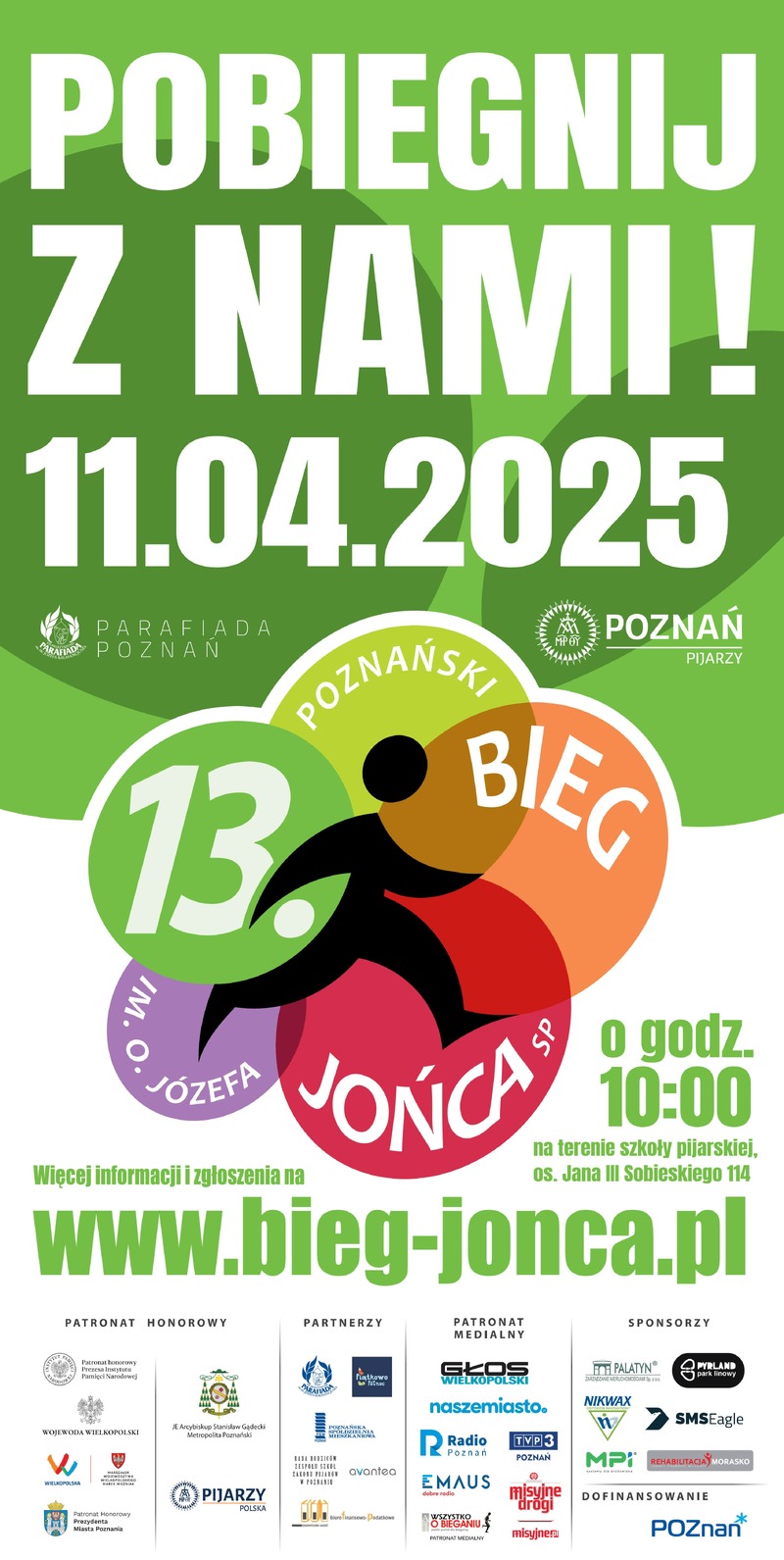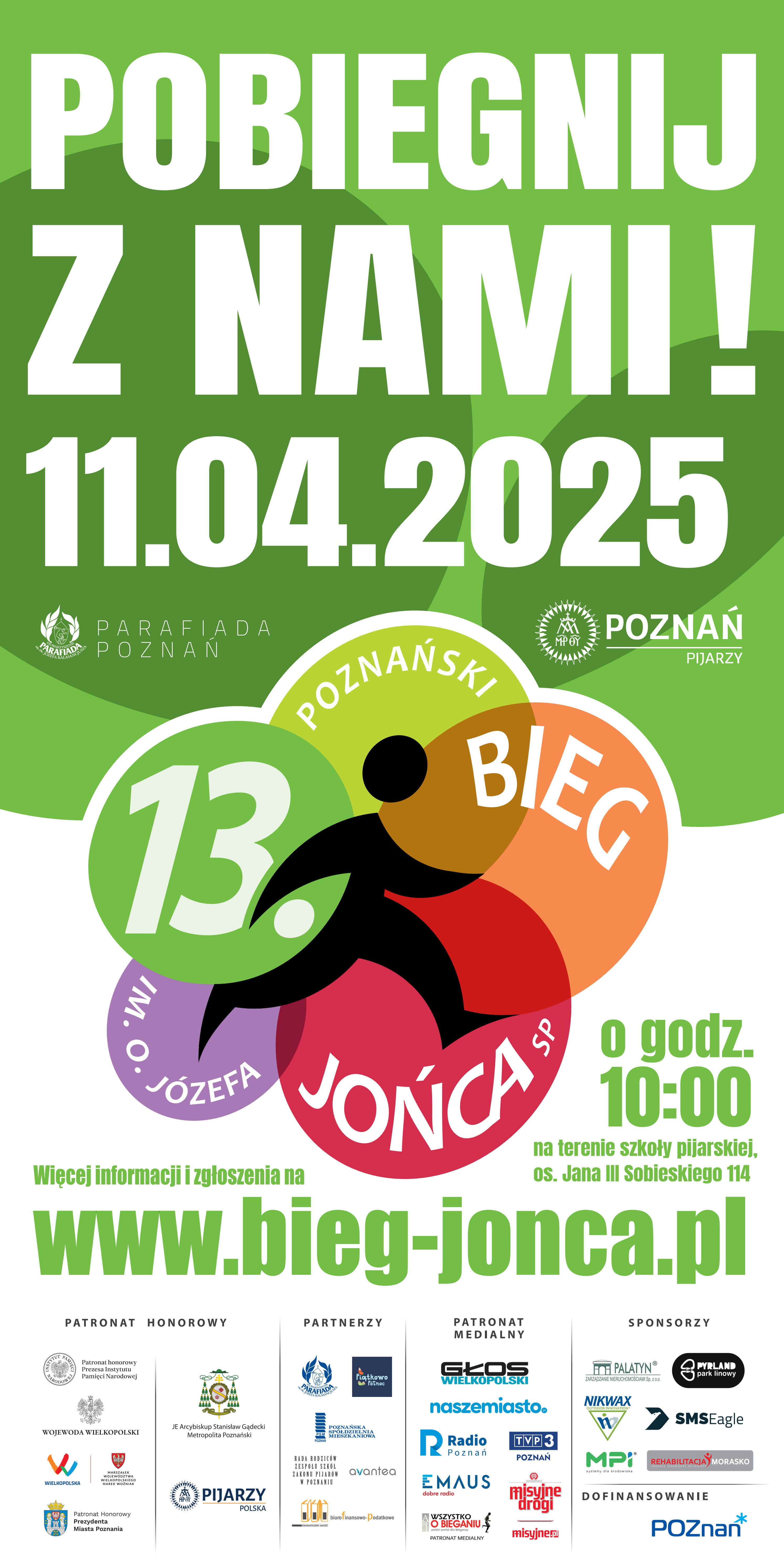11 kwietnia 2025 r. odbędzie się 13. Bieg Jońca. To cykliczna, wieloletnia inicjatywa sportowa, odbywająca się dla upamiętnienia postaci ojca Józefa Jońca (1959-2010), księdza, zakonnika Zakonu Pijarów, pomysłodawcy i realizatora wielu działań o charakterze edukacyjnym. Ojciec Joniec był założycielem Szkoły Podstawowej im. Ojca Onufrego Kopczyńskiego w Warszawie, współuczestniczył w powstaniu Katolickiego Stowarzyszenia Sportowego RP i Stowarzyszenia Wychowanków Szkół Zakonu Pijarów im. ks. Stanisława Konarskiego. Był zaangażowany w ruch parafiadowy, dbający o wychowanie młodego pokolenia Polaków. W ramach tej działalności zainicjował akcję sadzenia 21 tys. dębów katyńskich. O. Józef Joniec zginął w 2010 r. w katastrofie polskiego samolotu, udając się na Polski cmentarz do Katynia. Od tego roku dla upamiętnienia jego postaci Zespół Szkół Zakonu Pijarów im. św. Józefa Kalasancjusza w Poznaniu organizuje coroczny bieg.