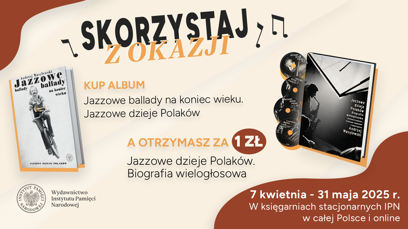 Zapraszamy do skorzystania ze specjalnej oferty promocyjnej Wydawnictwa IPN: kup album „Jazzowe ballady na koniec wieku. Jazzowe dzieje Polaków”, a „Jazzowe dzieje Polaków. Biografia wielogłosowa” otrzymasz za 1zł.