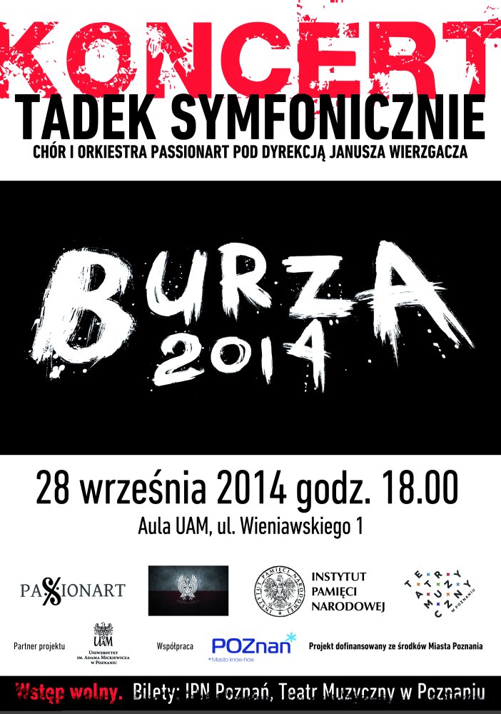 Instytut Pamięci Narodowej Oddział w Poznaniu, Stowarzyszenie PASSIONART z Krakowa, Teatr Muzyczny w Poznaniu oraz Wydział Kultury i Dziedzictwa Urzędu Miasta Poznania są organizatorami wyjątkowego koncertu patriotycznego. Koncert „Tadek symfonicznie – Burza 2014", zwieńczający tegoroczne obchody 75. rocznicy utworzenia Polskiego Państwa Podziemnego, odbył się w niedzielę 28 września  2014 w Auli UAM przy ul. Wieniawskiego 1 w Poznaniu.