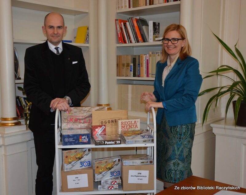 28 listopada Biblioteka Raczyńskich wzbogaciła się o ponad 100 gier!Instytut Pamięci Narodowej, reprezentowany przez dr. Rafała Reczka – dyrektorapoznańskiego oddziału – przekazał w darze szereg historycznych gierplanszowych: „303", „Kolejka", „Reglamentacja", „Ogonek", „Pamięć '39", „ZnajZnak". Pracownicy filii zostaną przeszkoleni z zakresu gier, aby CzytelnicyBiblioteki mogli w pełni cieszyć się z daru.