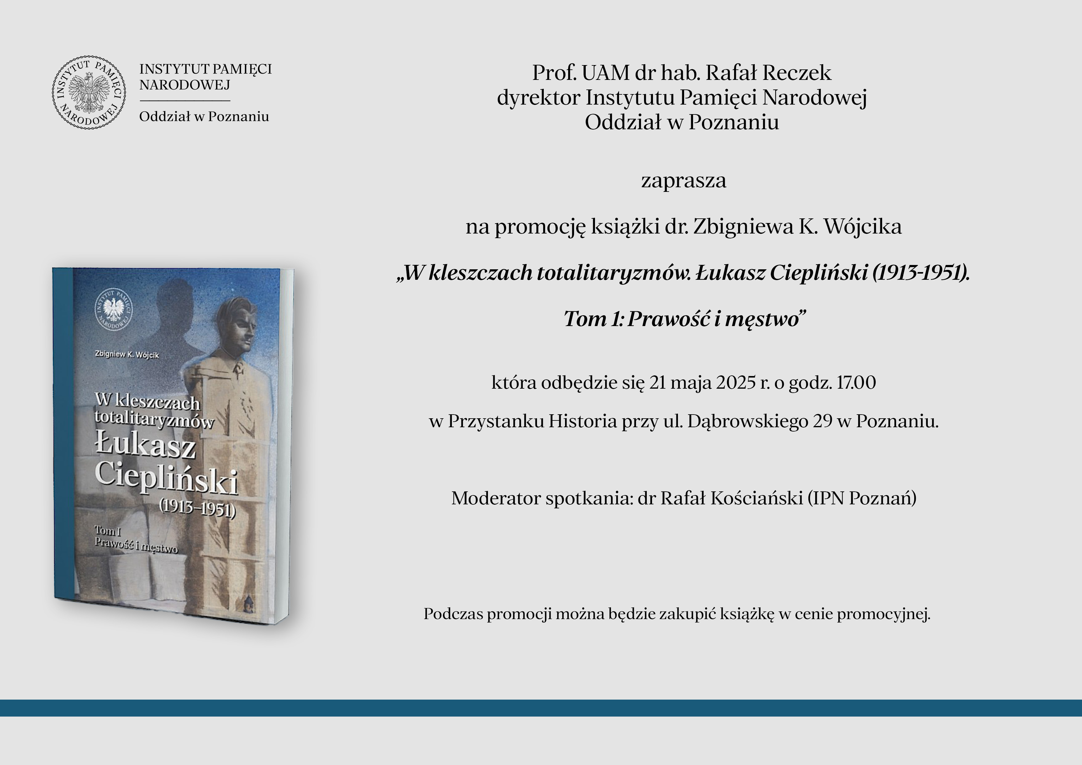 Zapraszamy na promocję książki dr. Zbigniewa K. Wójcika „W kleszczach totalitaryzmów. Łukasz Ciepliński (1913–1951). Tom I. Prawość męstwo”, która odbędzie się: