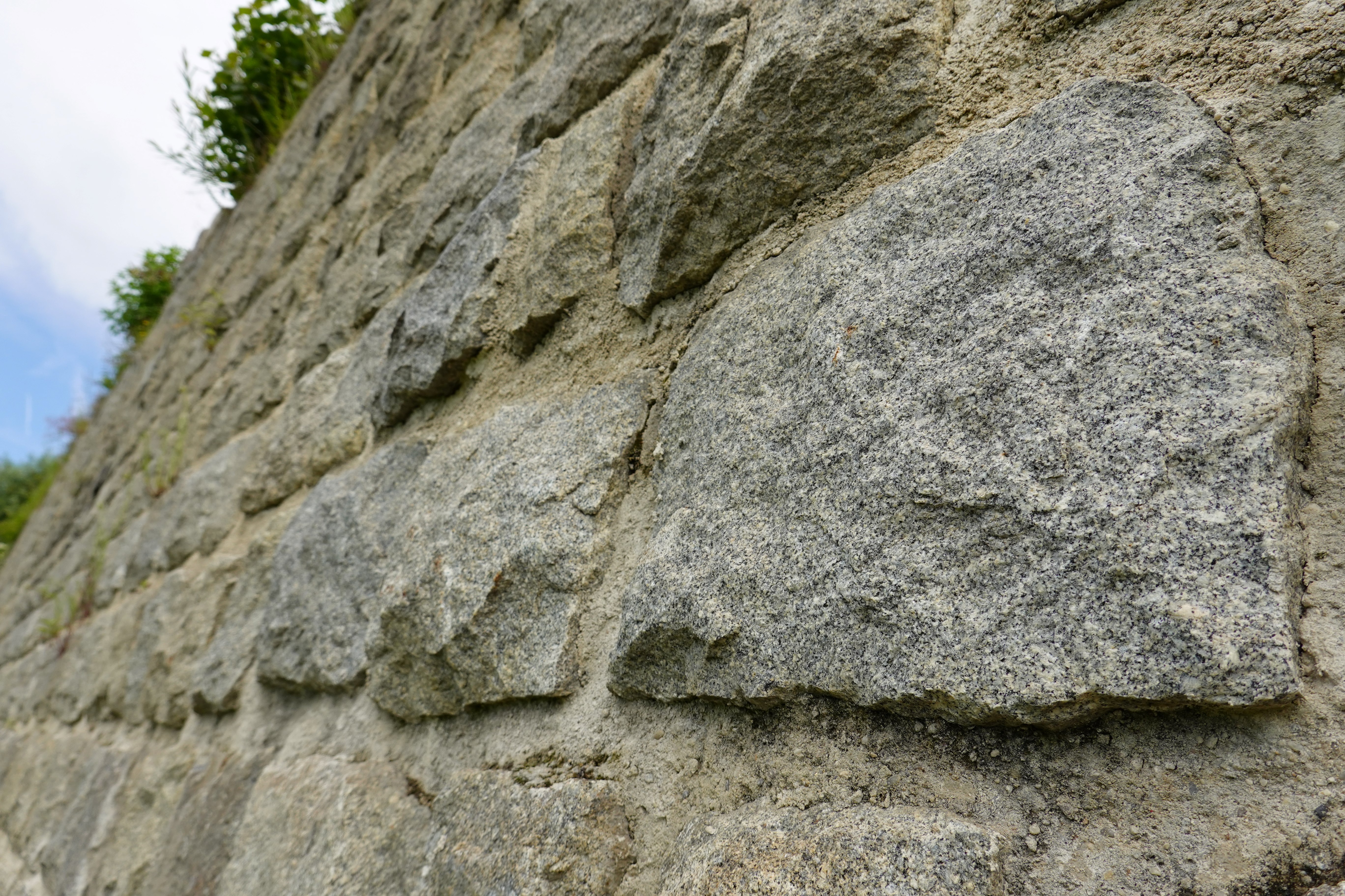 Teren byłego placu apelowego w KL Gusen. Widok na pozostałości muru oporowego zbudowanego przez więźniów KL Gusen. Stan obecny. Fot. Tomasz Cieślak (IPN) -