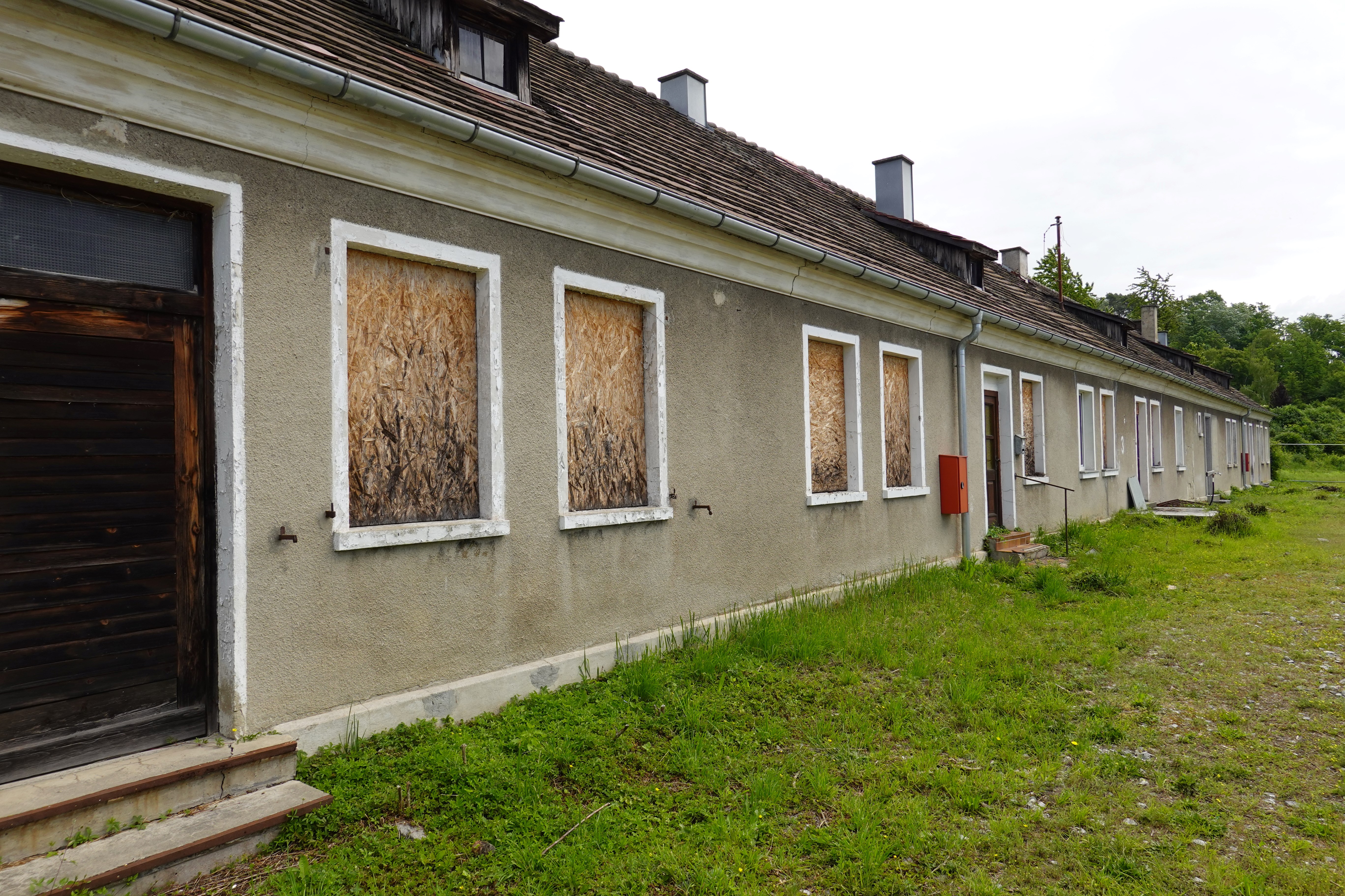 Teren byłego placu apelowego w KL Gusen. Widok na dwa byłe baraki KL Gusen. Stan obecny. Fot. Tomasz Cieślak (IPN) -