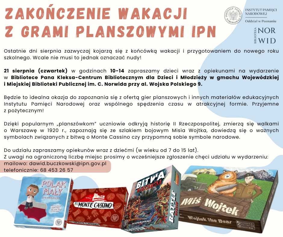 W czwartek 21 sierpnia 2025 r. w godzinach 10:00-14:00 zapraszamy dzieci wraz z opiekunami na wydarzenie „Zakończenie wakacji z grami planszowymi IPN” w Bibliotece Pana Kleksa-Centrum Bibliotecznym dla Dzieci i Młodzieży w gmachu Wojewódzkiej i Miejskiej Biblioteki Publicznej im. C. Norwida przy al. Wojska Polskiego 9 w Zielonej Górze.