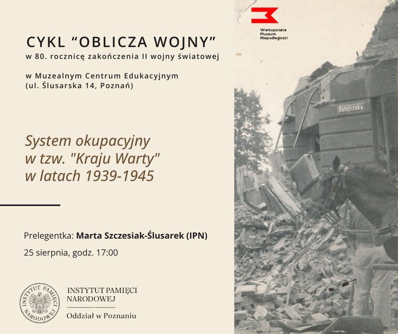 Zapraszamy na wykład Marty Szczesiak-Ślusarek pt. „System okupacyjny w tzw. Kraju Warty w latach 1939-1945”, który w ramach cyklu „Oblicza wojny”, odbędzie się 25 sierpnia 2025 r. godz. 17:00 w Muzealnym Centrum Edukacyjnym Wielkopolskiego Muzeum Niepodległości przy ul. Ślusarskiej 14 w Poznaniu.