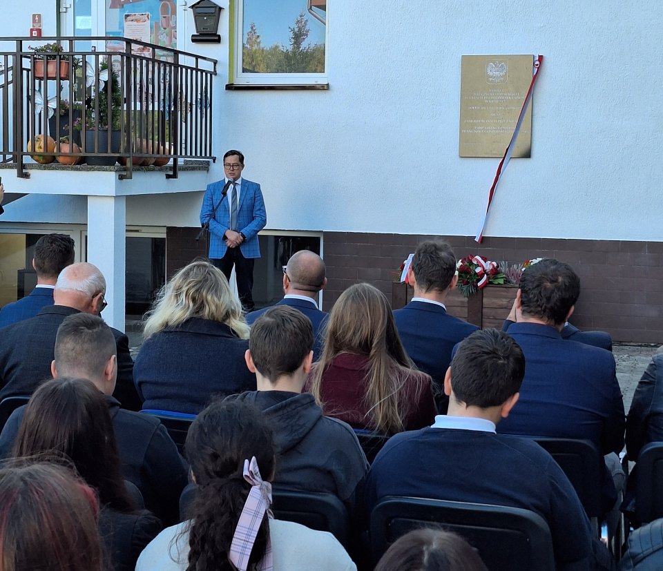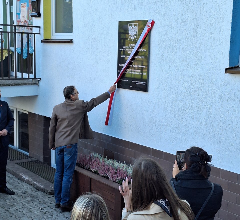 Po odśpiewaniu hymnu państwowego i powitaniu gości przez włodarzy gminy, Piotr Janusz Tomasz, inicjator upamiętnienia, został poproszony przez burmistrza Michalskiego i dyrektora szkoły Andrzeja Pietrzaka o odsłonięcie tablicy, następnie proboszcz parafii pw. św. Anny w Krajence, ksiądz kanonik Grzegorz Fabiszak, po krótkiej modlitwie dokonał jej poświęcenia. Głos zabrali zaproszeni goście, w tym naczelnik Wojciech Chałupka, który podkreślił cierpienie nauczycieli w czasie wojny. Po wystąpieniach złożono kwiaty pod tablicą. Uroczystość zakończył występ dzieci, które wykonały „Rotę”.
