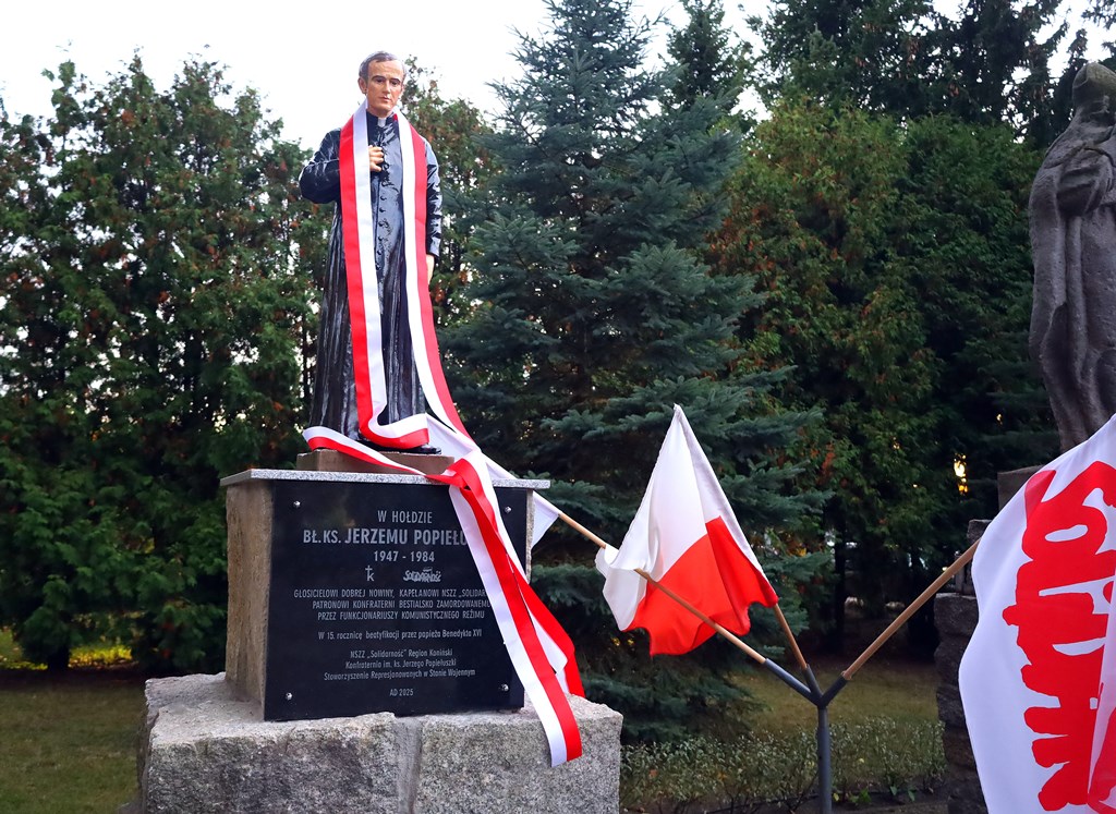 Po odsłonięciu tablicy licznie zebrani uczestnicy przeszli do pobliskiego kościoła w procesji z relikwiami bł. ks. Jerzego Popiełuszki (niesionymi przez przewodniczącego NSZZ „Solidarność” Region Koniński Artura Skiersza). Po mszy świętej, której przewodniczył ks. bp Wiesław Mering, miała miejsce kolejna część uroczystości – odsłonięcie pomnika zamordowanego Kapłana. Kwiaty pod monumentem złożyli członkowie Konfraterni oraz reprezentujący IPN Konrad Białecki.
