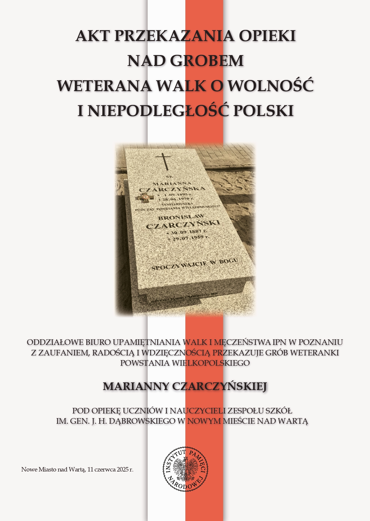 W Dniu Edukacji Narodowej 14 października 2025 r. gościliśmy po raz trzeci w Zespole Szkół im. gen. J.H. Dąbrowskiego w Nowym Mieście nad Wartą. Uczniowie oraz nauczyciele tej placówki zobowiązali się tym razem dbać o grób Marianny Czarczyńskiej znajdujący się na cmentarzu parafialnym. Ta urodzona w 1895 r. właśnie w Nowym Mieście weteranka była sanitariuszką podczas Powstania Wielkopolskiego. Instytut Pamięci Narodowej sfinansował postawienie nowego nagrobka na mogile bohaterki i jej męża Bronisława.