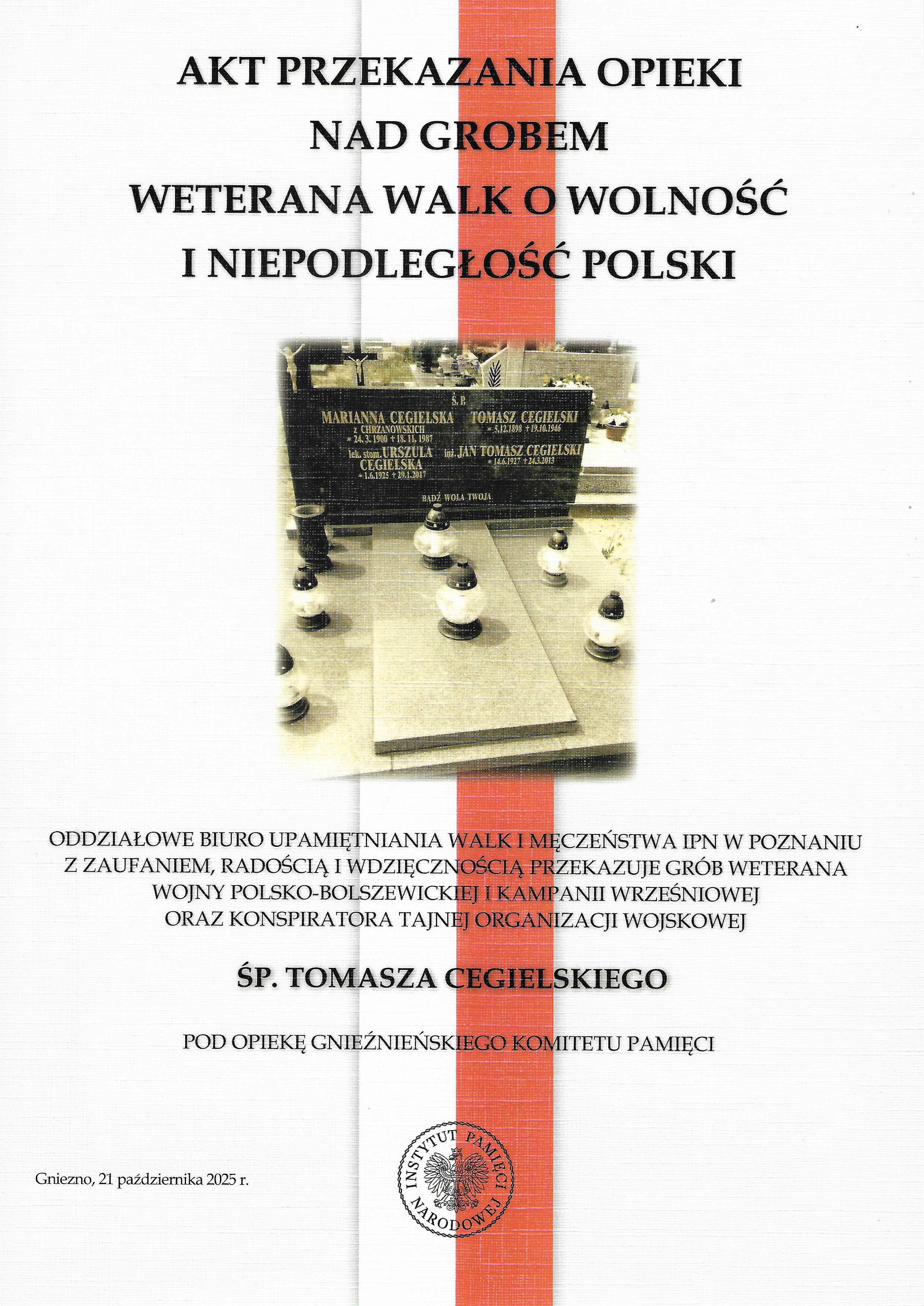 Tydzień później 21 października 2025 r. odwiedziliśmy parafię pw. Chrystusa Wieczystego Kapłana w Gnieźnie, gdzie odbyła się uroczystość przekazania opieki nad grobem Tomasz Cegielskiego, weterana walk o wolność i niepodległość Polski, sierż. 69 Pułku Piechoty, odznaczonego w wieku 22 lat Orderem Wojennym Virtuti Militari. Mogiła znajduje się na Cmentarzu Parafii pw. św. Trójcy w Gnieźnie. W spotkaniu wzięły udział córki weterana: Panie Teodozja Gronkowska i Teresa Cegielska. Opieki nad grobem Tomasza Cegielskiego – żołnierza Armii Generała Hallera, biorącego udział w wojnie polsko-ukraińskiej, polsko-bolszewickiej, II wojnie światowej w szeregach Armii „Poznań”, członka Tajnej Organizacji Wojskowej, a także więźnia niemieckich obozów koncentracyjnych – podjął się Gnieźnieński Komitet Pamięci.