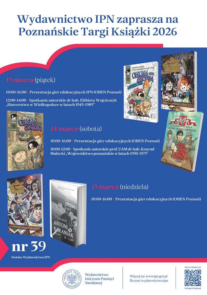 Podczas Poznańskich Targów Książki Wydawnictwo IPN będzie prezentowało swoją szeroką ofertę na stoisku 39 w pawilonie 8A w atrakcyjnych cenach –50% (nie dotyczy gier, dotyczy wyłącznie klientów indywidualnych).