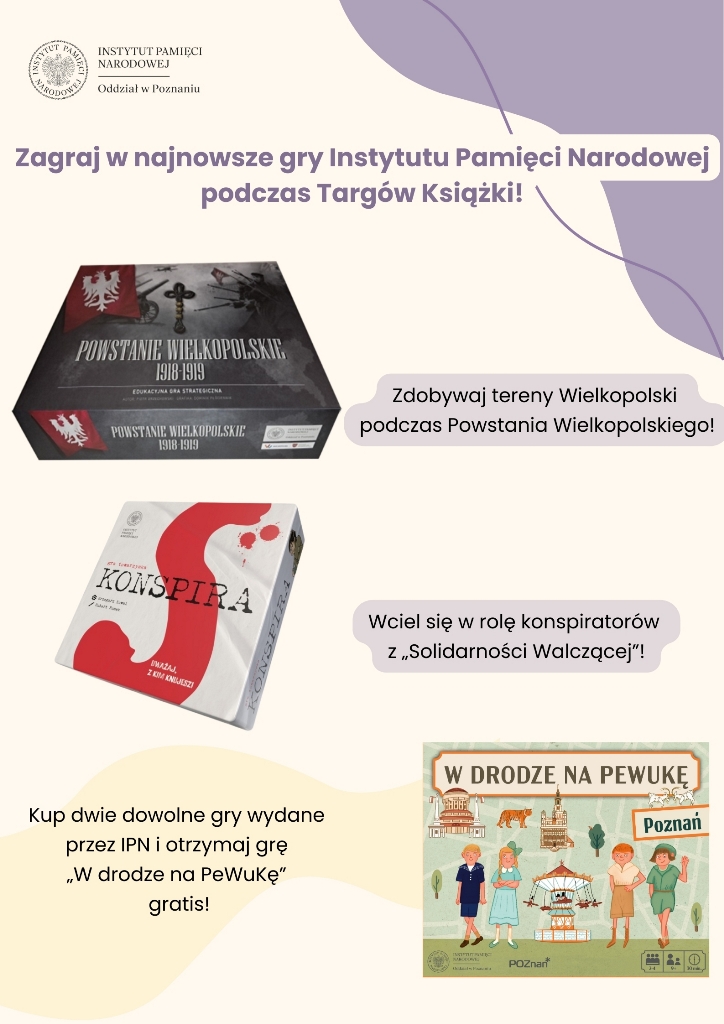 Gry IPN, m.in. „Konspira” i „Powstanie Wielkopolskie 1918/1919”, będą dostępne w sprzedaży. Osoby, które podczas targów zakupią dowolne dwie gry z oferty IPN otrzymają egzemplarz gry „W drodze na PeWuKę” gratis!