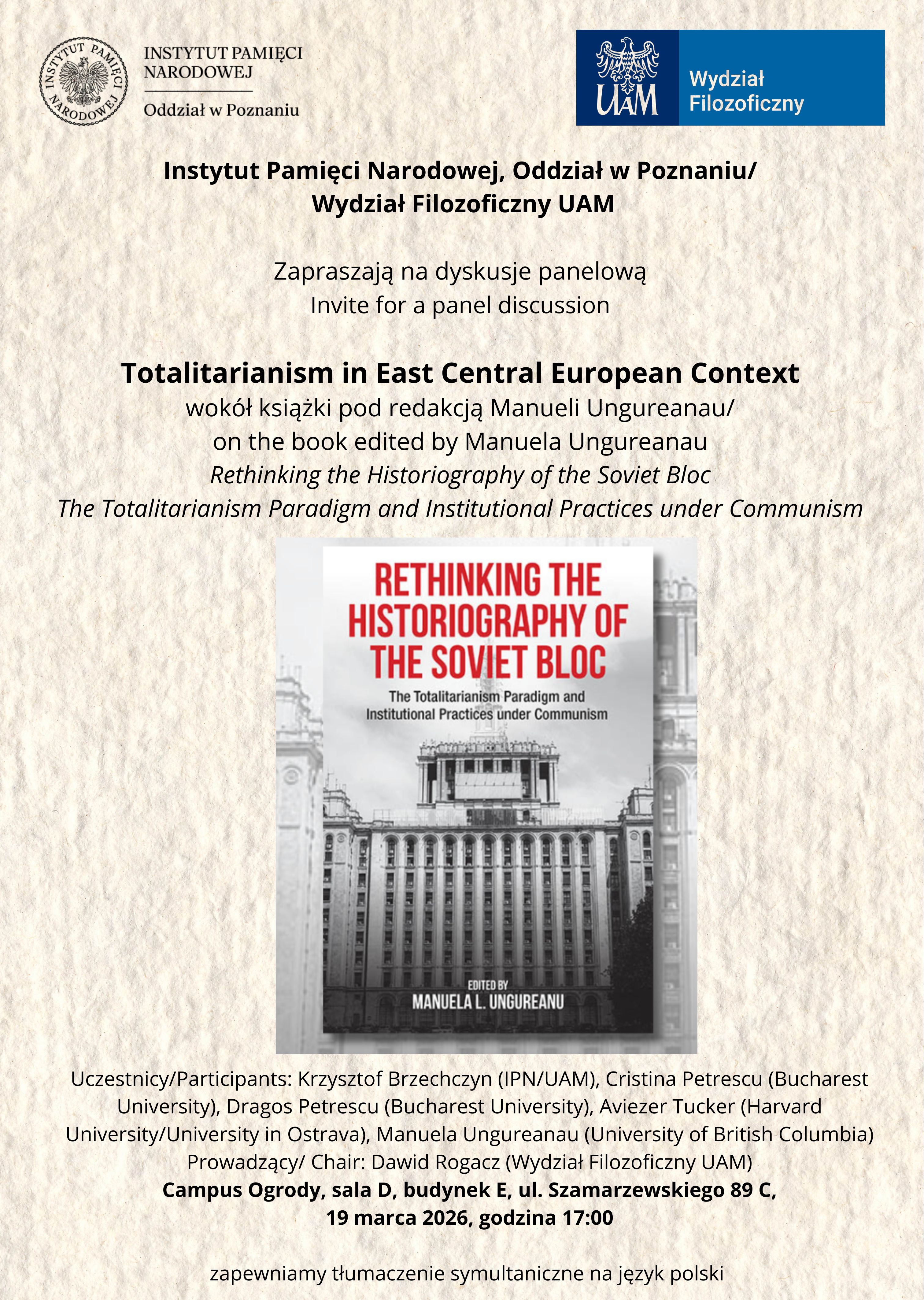 Wraz z Wydziałem Filozoficznym UAM zapraszamy na dyskusję panelową „Totalitarianism in East Central European Context” („Totalitaryzm w kontekście Europy Środkowo-Wschodniej”) wokół książki pod redakcją Manueli Ungureanu „Rethinking the Historiography of the Soviet Bloc: The Totalitarianism Paradigm and Institutional Practices under Communism” (Berghahn Books 2026).