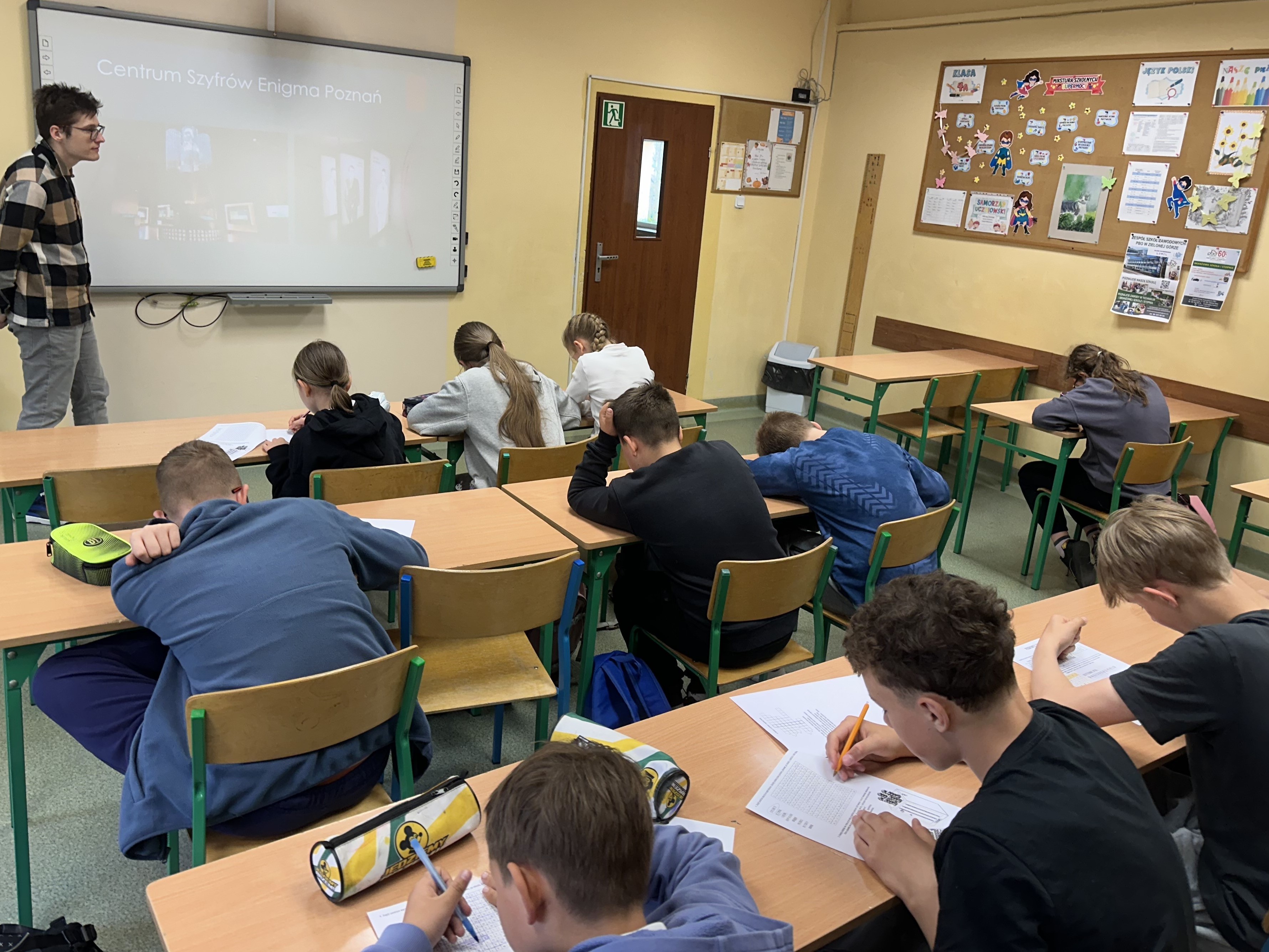 20 kwietnia 2026 r. w Szkole Podstawowej im. Janusza Korczaka w Czerwieńsku miało miejsce spotkanie edukacyjne dla uczniów czwartych i piątych klas. Pracownicy poznańskiego oddziału Instytutu Pamięci Narodowej, Dawid Buczkowski oraz Krzysztof Mazur, poprowadzili serię warsztatów edukacyjnych „Pogromcy Enigmy”.