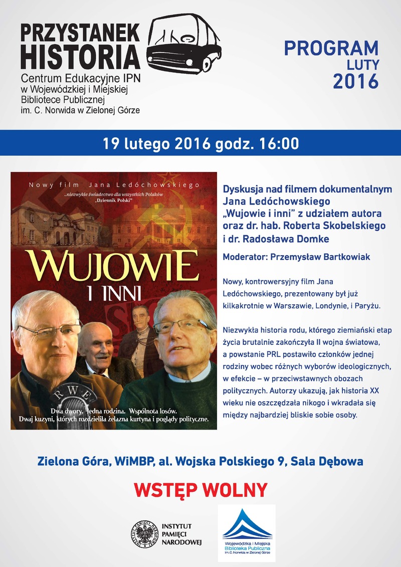 Centrum Edukacyjne IPN „Przystanek Historia” w Wojewódzkiej i Miejskiej Bibliotece Publicznej im. Cypriana Norwida w Zielonej Górze zaprasza 19 lutego 2016 roku, o godz. 16.00, na pokaz filmu Jana Ledóchowskiego „Wujowie i inni”. Po projekcji filmowej odbędzie się się dyskusja z udziałem reżysera filmu Jana Ledóchowskiego, dr. hab. Roberta Skobelskiego i dr. Radosława Domkego.  Moderator: Przemysław Bartkowiak