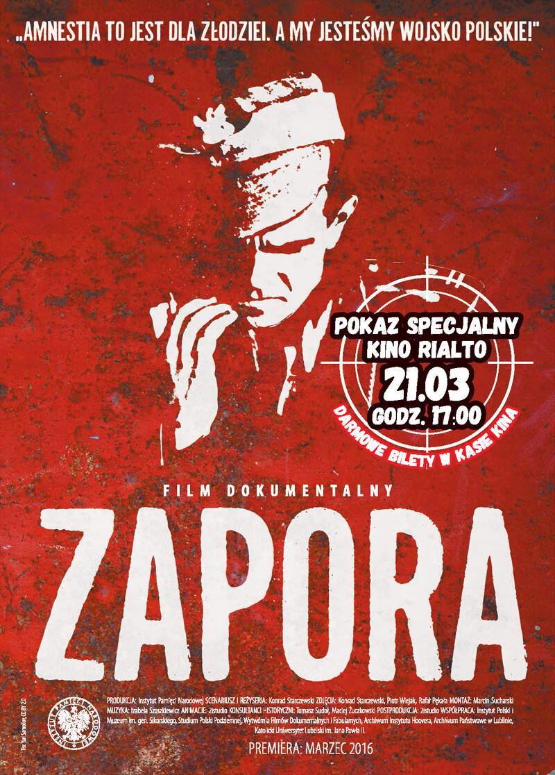 W poniedziałkowe popołudnie, 21 marca 2016 roku, w poznańskim, studyjnym kinie Rialto odbył się pokaz specjalny najnowszego projektu filmowego Instytutu Pamięci Narodowej pt. „Zapora”. W spotkaniu udział wzięli twórcy filmu: Konrad Starczewski – reżyser i scenarzysta, Izabela Szoszkiewicz – autorka muzyki do filmu i Sławek Karasek z 2istudio – twórca animacji.