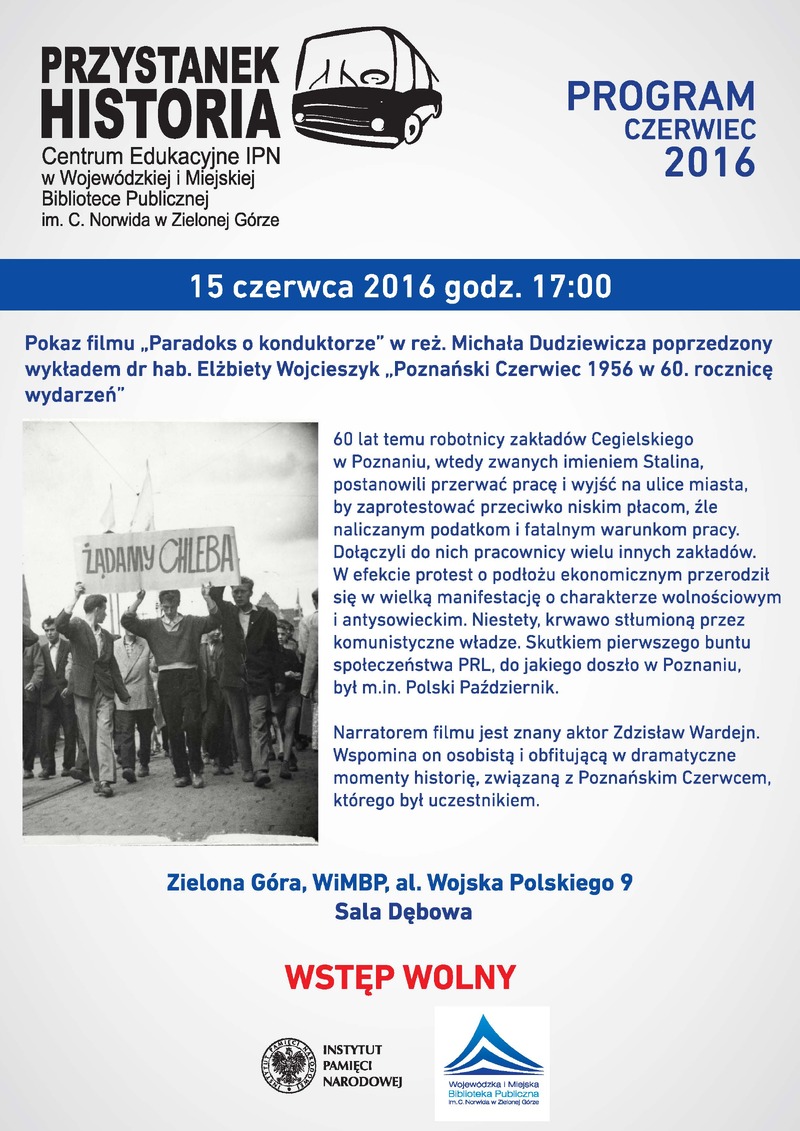 W środowe popołudnie, 15 czerwca 2016 roku, w Centrum Edukacyjnym IPN „Przystanek Historia” w Wojewódzkiej i Miejskiej Bibliotece Publicznej im. Cypriana Norwida odbył się pokaz filmu „Paradoks o konduktorze” w reż. Michała Dudziewicza, poprzedzony wykładem dr hab. Elżbiety Wojcieszyk o Poznańskim Czerwcu 1956 w 60. rocznicę wydarzeń