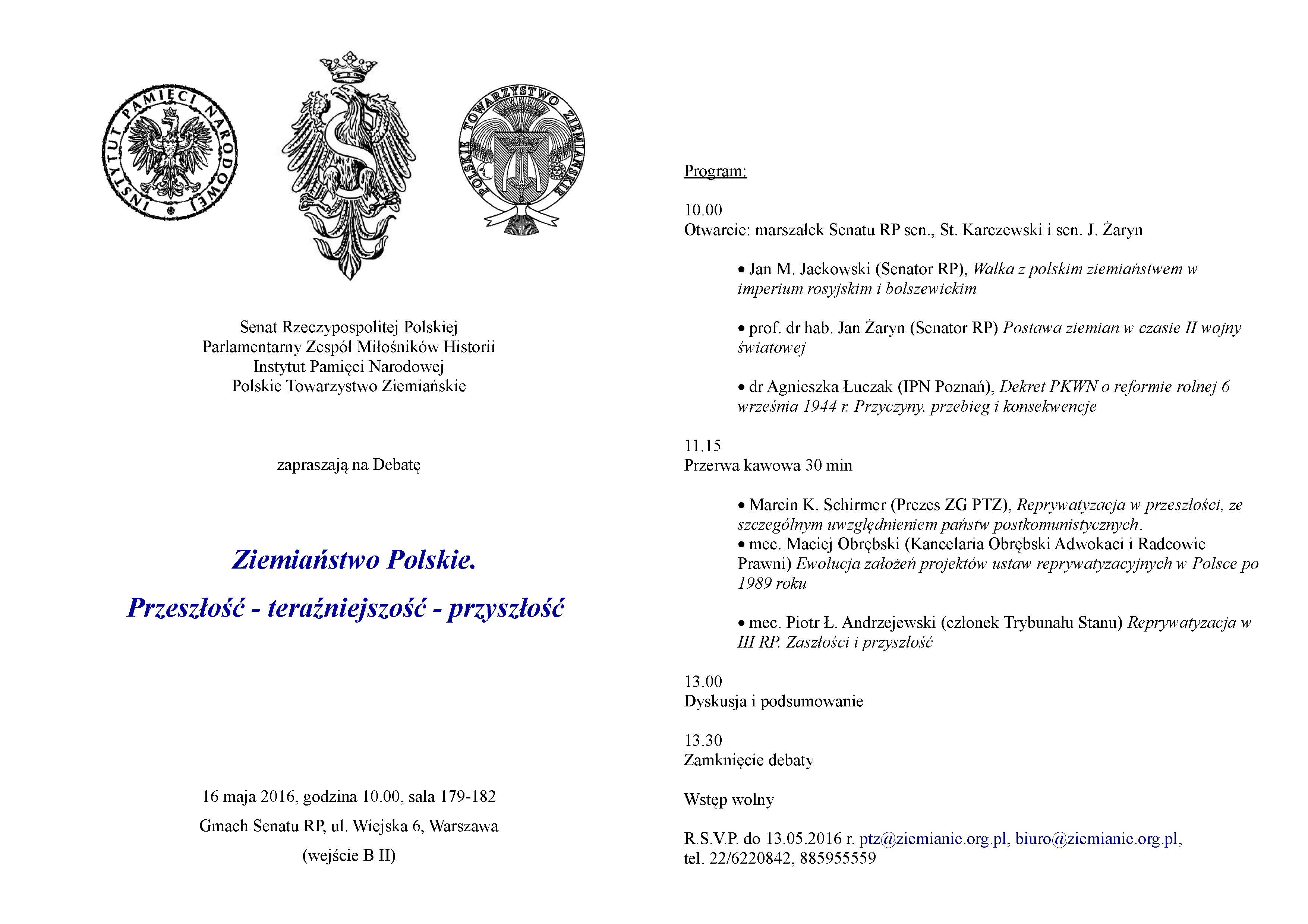 Senat Rzeczypospolitej Polskiej, Parlamentarny Zespół Miłośników Historii, Instytut Pamięci Narodowej Oddział w Poznaniu i Polskie Towarzystwo Ziemiańskie zapraszają 16 maja 2016 roku (poniedziałek) na debatę poświęconą histori ziemiaństwa w Polsce pt. „Ziemiaństwo polskie. Przeszłość – teraźniejszość – przyszłość”.