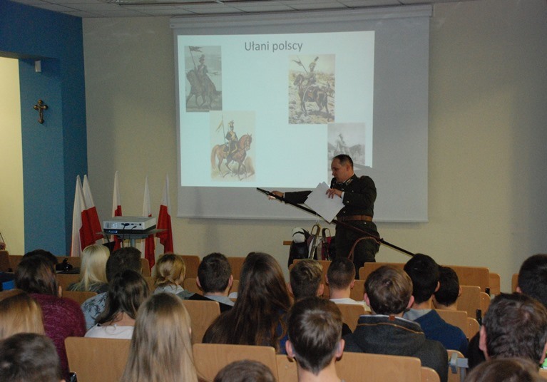 Niepodległościowa akademia została wzbogacona o pieśni patriotyczne w wykonaniu chóru szkolnego i Lucyny Knop. Gościem specjalnym spotkania był Paweł Kochański z Instytutu Pamięci Narodowej w Poznaniu, który jest jednocześnie ułanem Oddziału Terenowego 17. Pułku Ułanów Wielkopolskich im. Króla Bolesława Chrobrego, Stowarzyszenia Polski Klub Kawaleryjski. Paweł Kochański oprócz prelekcji o naszych narodowych tradycjach, świętach narodowych i miejscu kawalerii w historii Polski, wzbogaconej pokazem multimedialnym zaprezentował, m.in. własne umundurowanie w barwach 17. Pułku Ułanów Wielkopolskich, siodło oficerskie wz. 25, szable wz. 21 i 34, lancę oraz hełmy kawaleryjskie. W trakcie spotkania przedstawiono także historię kawalerii powstania wielkopolskiego. Musimy pamiętać o własnej historii, bo jak powiedział przywoływany w opowieści Pawła Kochańskiego – Józef Piłsudzki: „Kto nie szanuje i nie ceni swojej przeszłości, ten nie jest godzien szacunku teraźniejszości, ani nie ma prawa do przyszłości”. Szczególnym wydarzeniem było specjalne spotkanie kawalerzysty z dziećmi z I Akademickiej Szkoły Podstawowej w Nowym Tomyślu, które bardzo żywo i wesoło przeżyły spotkanie z ułanem.