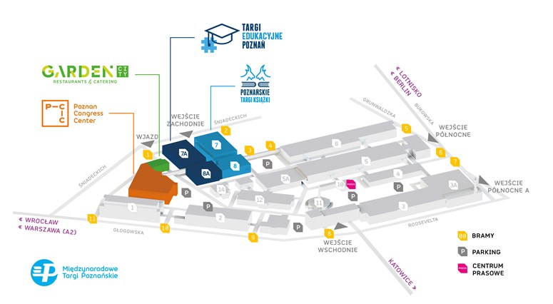 Na Poznańskie Targi Książki 2020 wejdziesz od strony dworca Poznań Główny (Hol Wschodni / Wejście Wschodnie), a także od ulicy Śniadeckich (Hol Zachodni / Wejście Zachodnie). Wydarzenie odbędzie się w pawilonach numer 7 i 8 – bezpośrednie wejście od ulicy Śniadeckich. W tym samym czasie odbędą się Targi Edukacyjne zlokalizowane w pawilonach 7A i 8A. Na oba wydarzenia wstęp jest bezpłatny. Na miejscu znajdują się szatnie.