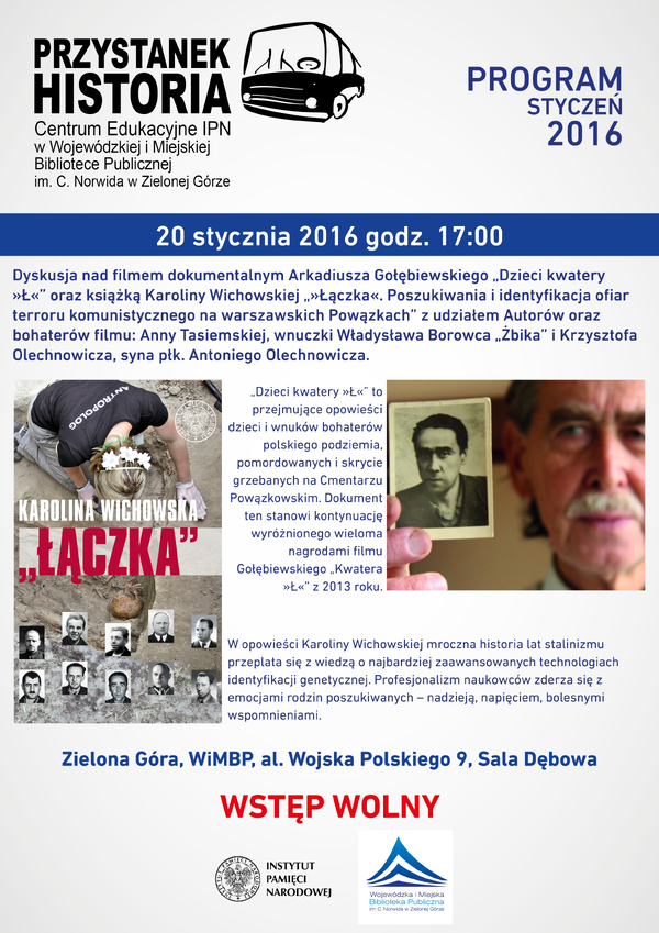 20/01/2016Pokaz filmu Arkadiusza Gołębiewskiego „Dzieci kwatery »Ł«” połączony z promocją książki Karoliny Wichowskiej „»Łączka«” w Centrum Edukacyjnym IPN „Przystanek Historia” w WIMBP im. C. Norwida – Zielona Góra, 20 stycznia 2016