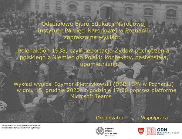 15/12/2020Dla nauczycieliWykład otwarty online „Polenaktion 1938, czyli deportacja Żydów pochodzenia polskiego z Niemiec do Polski: konteksty, następstwa, upamiętnienie” – MS Teams, 15 grudnia 2020, godz. 17:00