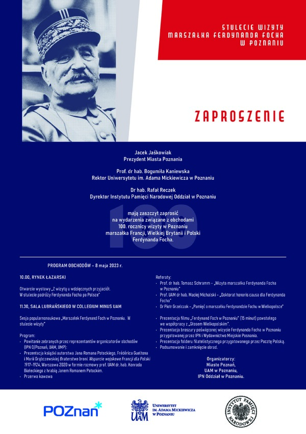 08/05/2023ZaproszenieStulecie wizyty Marszałka Ferdynanda Focha w Poznaniu – 8 maja 2023
