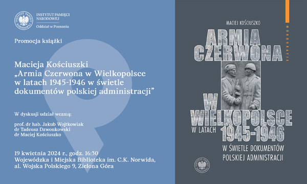 19/04/2024ZaproszeniePromocja książki Macieja Kościuszki „Armia Czerwona w Wielkopolsce w latach 1945-1946 w świetle dokumentów polskiej administracji” – Zielona Góra, 19 kwietnia 2024