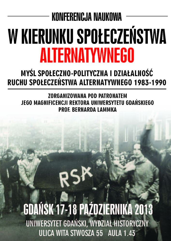 W ramach Centralnego Projektu Badawczego Opozycja w Polsce 1976–1989. Encyklopedia Solidarności Europejskie Centrum Solidarności, Oddziałowe Biuro Edukacji Publicznej IPN w Poznaniu i Gdańsku, Parlament Studentów Uniwersytetu Gdańskiego, Rada Doktorantów Uniwersytetu Gdańskiego, Region Gdański NSZZ „Solidarność" oraz Wydział Historyczny Uniwersytetu Gdańskiego zapraszają w dniach 17–18 października 2013 r. do udziału w konferencji naukowej „W kierunku społeczeństwa alternatywnego. Myśl społeczno-polityczna i działalność Ruchu Społeczeństwa Alternatywnego 1983–1990". Patronat nad konferencją sprawuje Jego Magnificencja Rektor Uniwersytetu Gdańskiego Prof. Bernard Lammek.